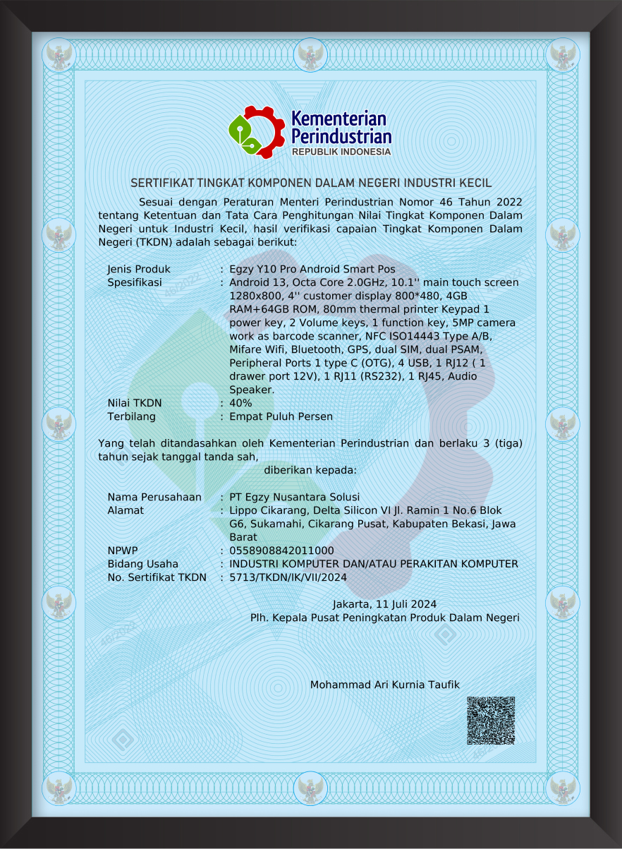 PT EGZY NUSANTARA SOLUSI adalah perusahaan yang telah berhasil memperoleh sertifikasi TKDN dengan nilai 40% untuk produk-produknya. Dengan komitmen pada penggunaan komponen dalam negeri, kami memastikan bahwa setiap produk yang kami hasilkan mampu bersaing. Keunggulan kami terletak pada kombinasi teknologi modern dan kualitas lokal, menjadikan kami mitra terpercaya dalam menyediakan solusi digital yang inovatif dan andal.